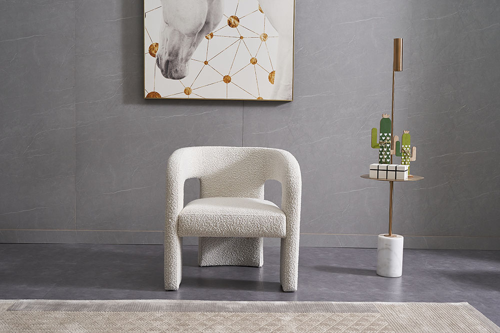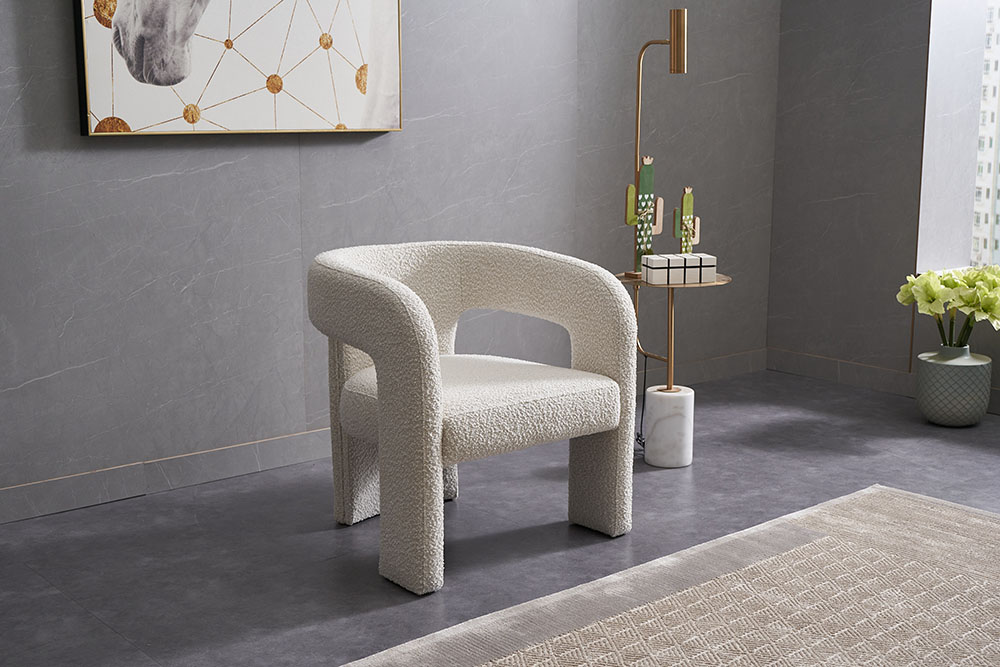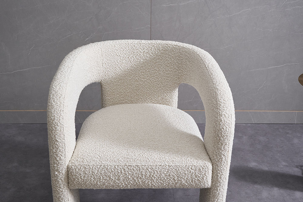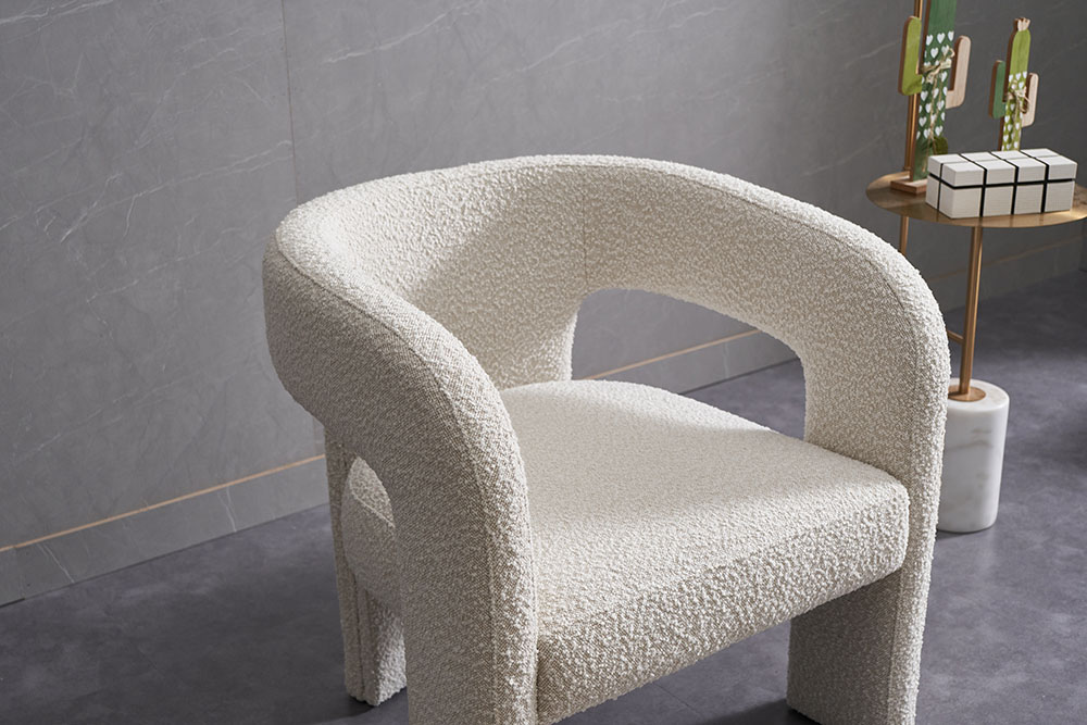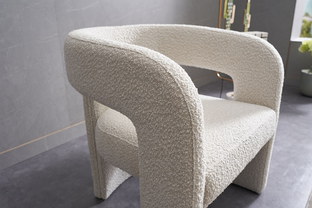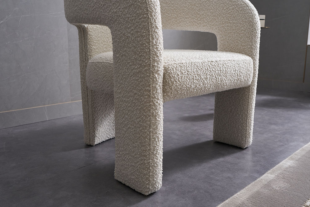 A minimalist, sculptural accent chair with a cozy boucle texture and bold shape.