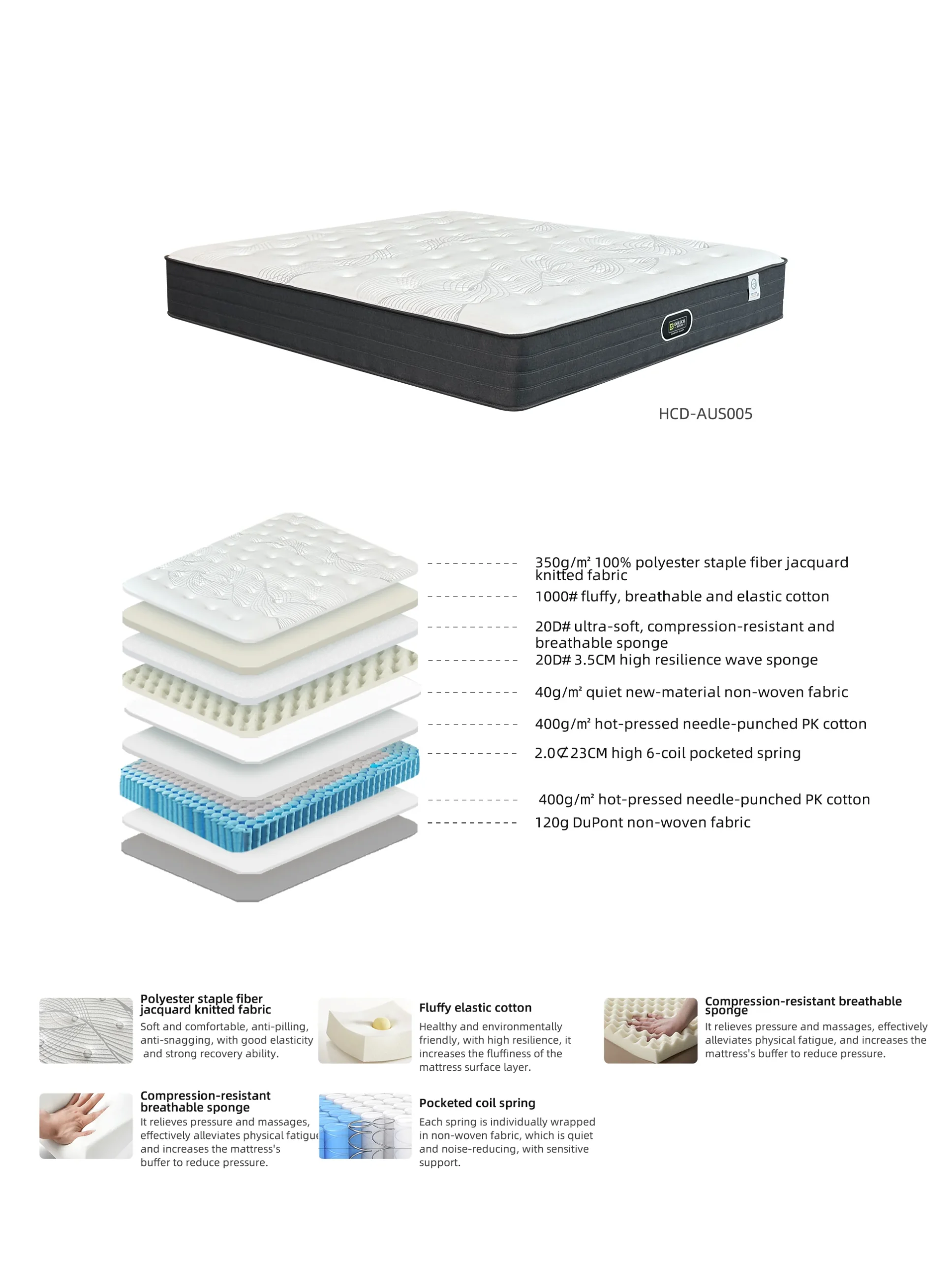 The HCD-AUS005 hybrid mattress is designed to deliver balanced comfort, breathability, and reliable support. It features a premium 350g/m² polyester staple fiber jacquard knitted fabric that is soft, elastic, and durable. Beneath the surface, 100# fluffy elastic cotton and 20D ultra-soft breathable sponge enhance cushioning, while a 3.5cm high-resilience wave sponge helps relieve pressure and promote airflow.
